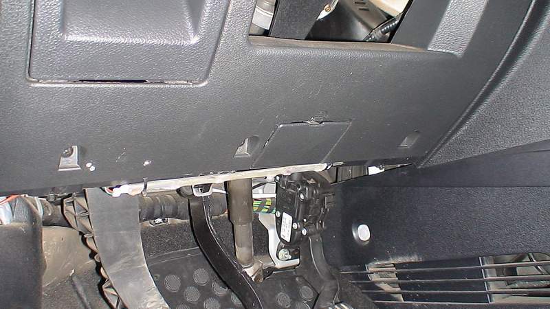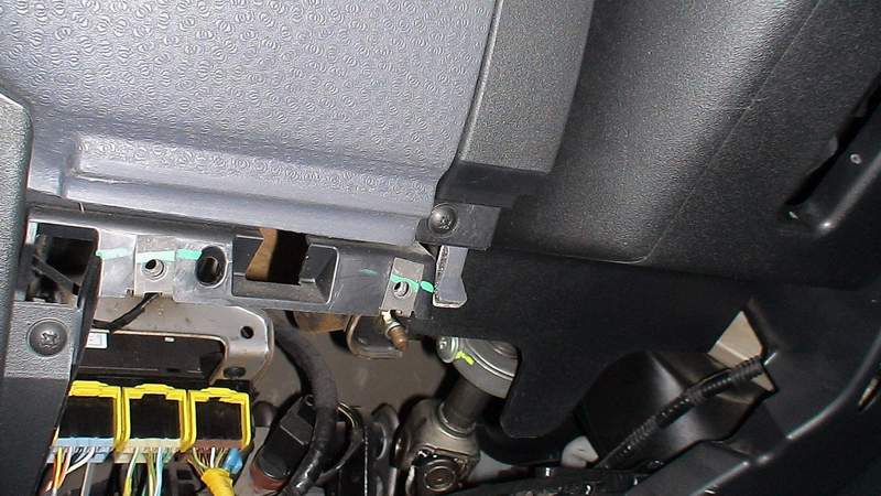 Сначала откидываем водительский бардачок и откручиваем под ним 2 самореза (Вынимать бардак смысла нет)